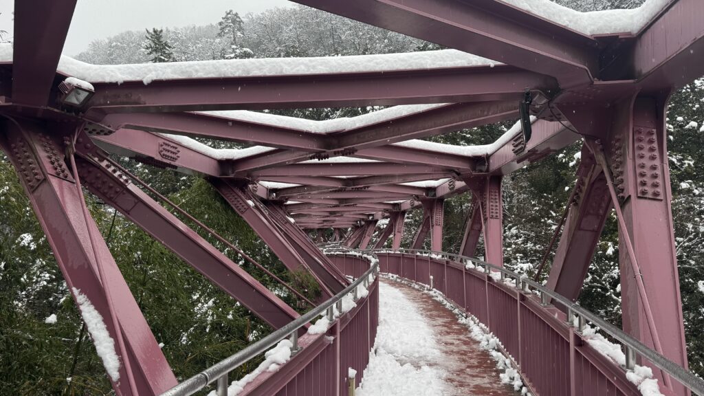 春は新緑に囲まれた鮮やかな赤が映え、夏は深い緑のトンネルの中で涼やかな風を感じられます。秋には紅葉と橋の赤が重なり合い、まさに絵画のような光景が広がります。そして冬、雪化粧をした渓谷に架かる赤い橋は、静寂の中に凛とした美しさを漂わせます。